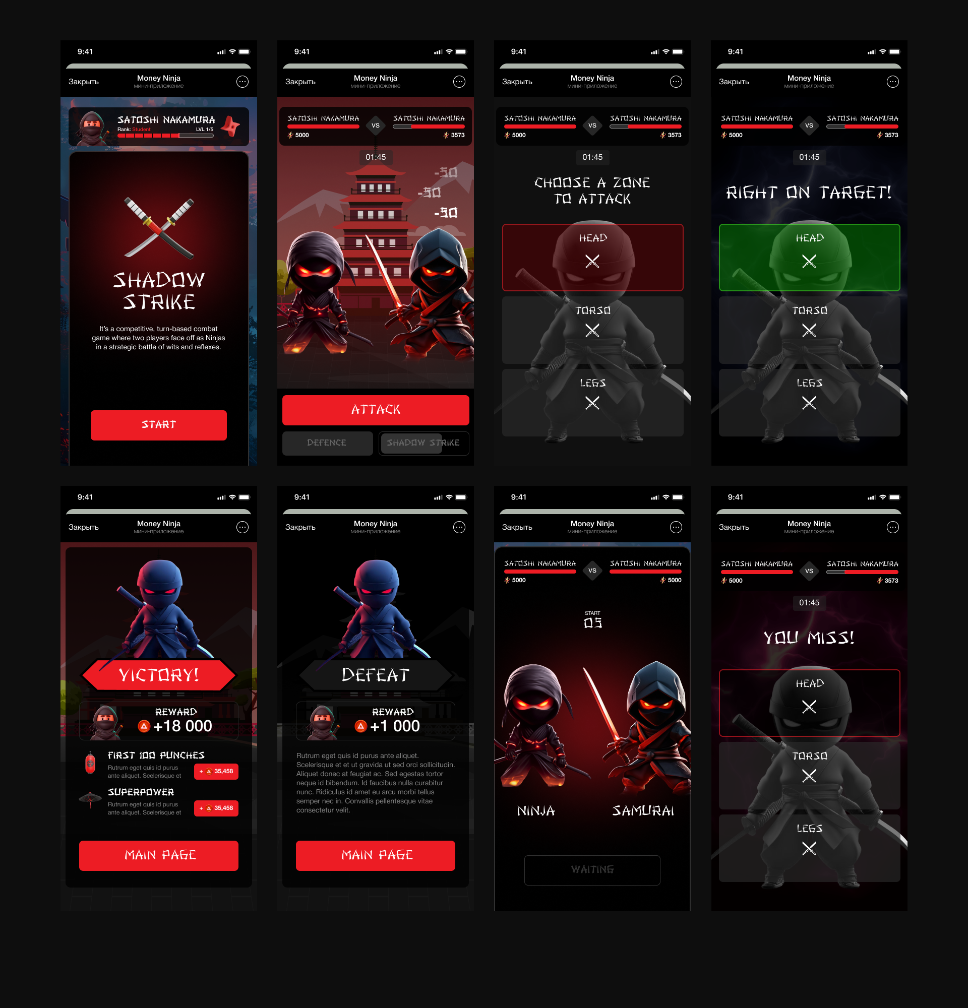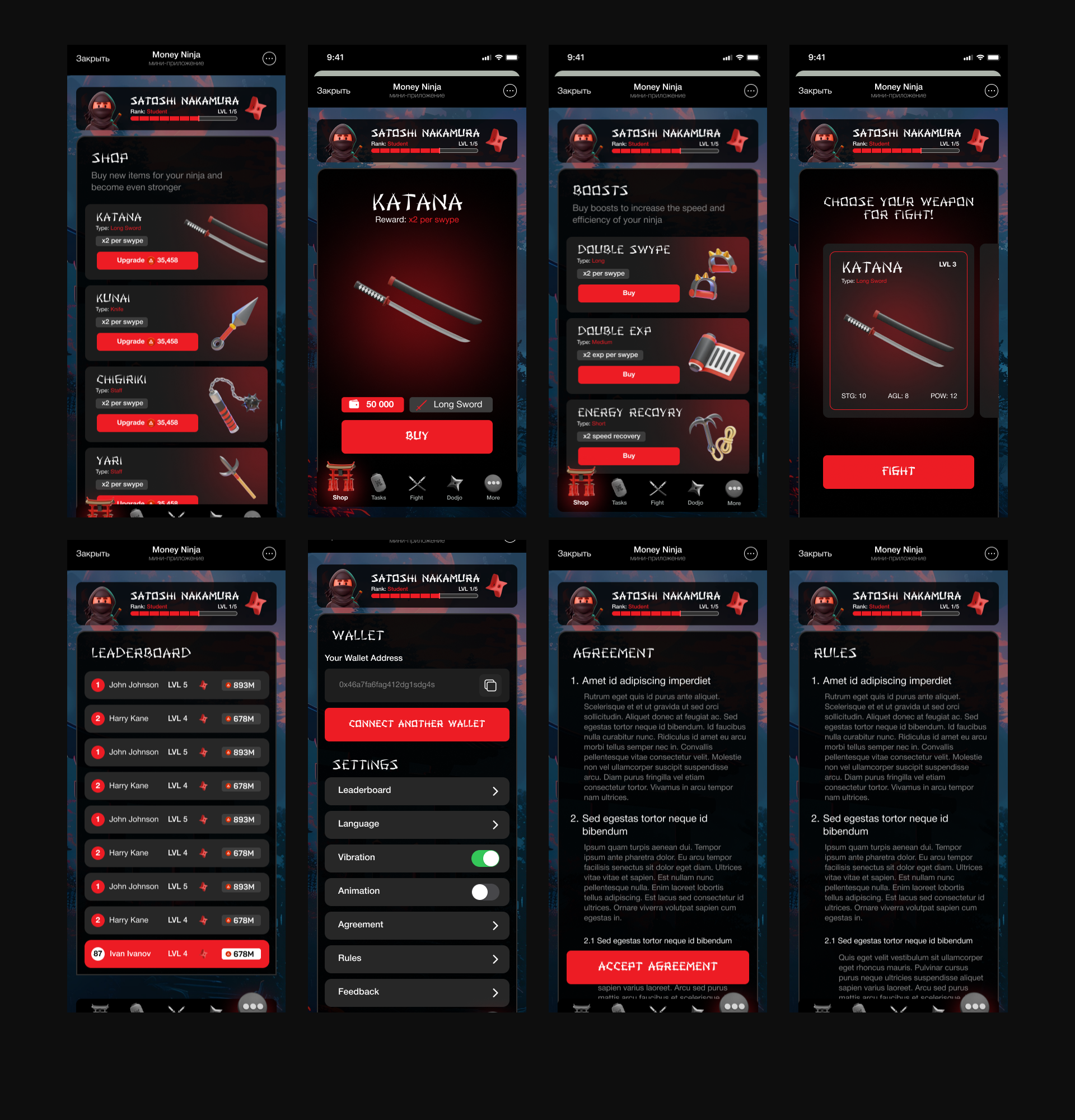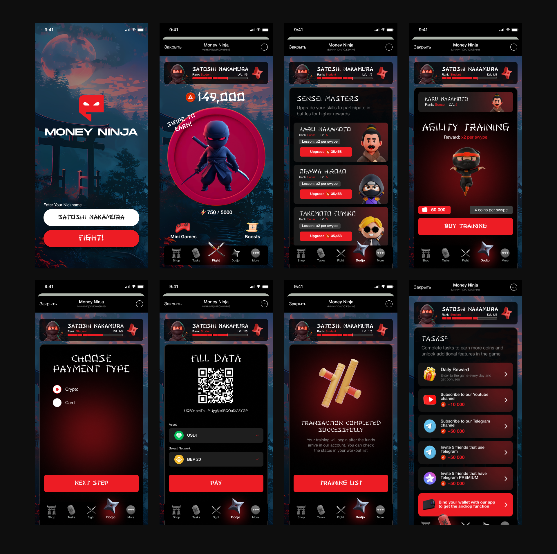 Динамичный свайп-файтинг с тремя зонами удара и навыками (Shadow Strike), выбор и апгрейт оружия, тренировки и Sensei Masters. Быстрый онбординг, кошелёк и ранний доступ, задания и daily reward. Оплата криптой/картой, экран QR с выбором токена и сети.