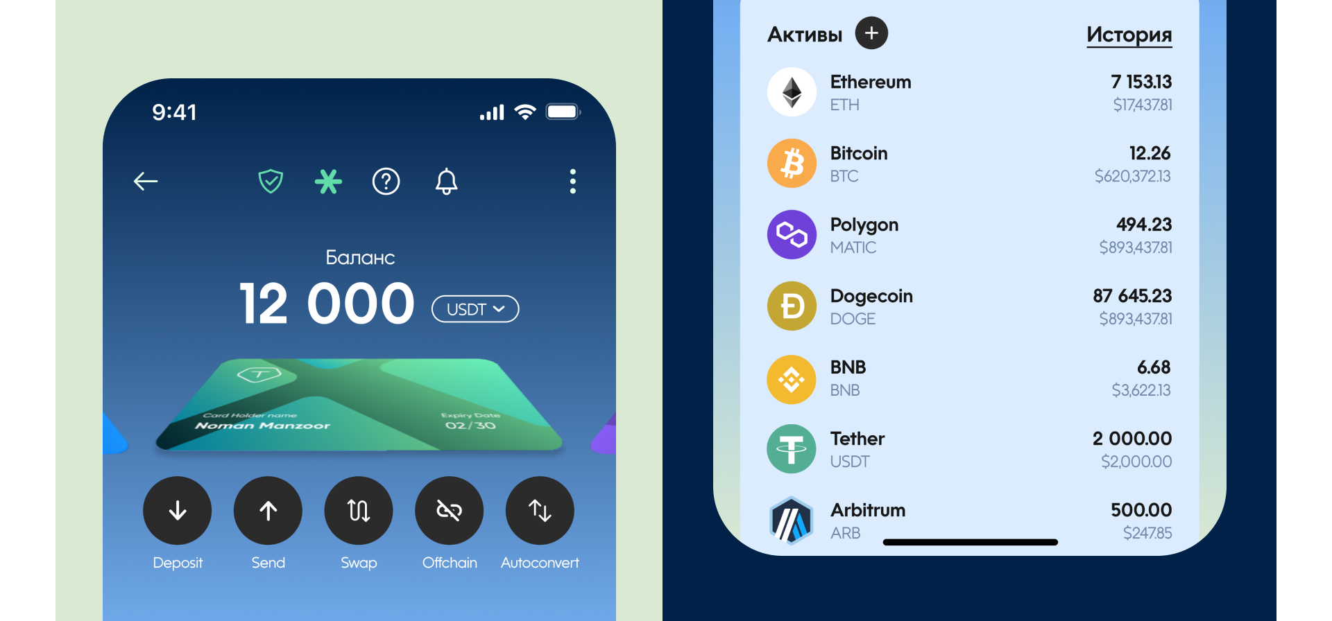 - Транзакции: Пополнение, переводы, оффчейн-операции.