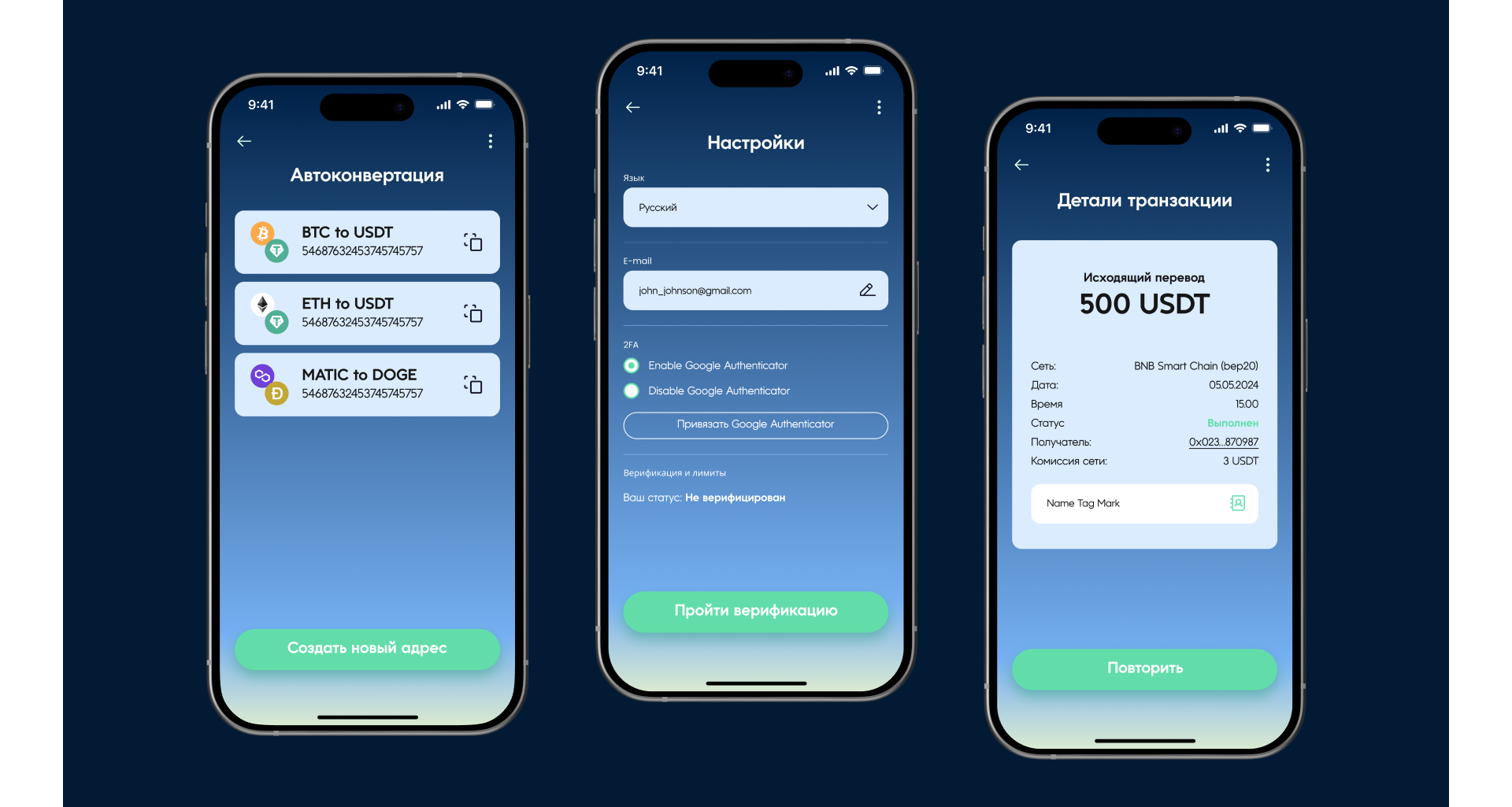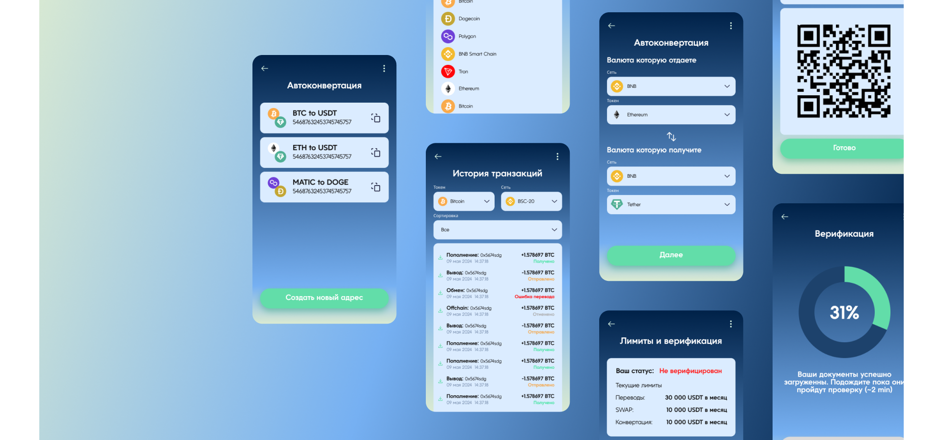 Приложение предназначено для безопасного управления криптовалютными активами. Оно позволяет пользователям осуществлять транзакции, обмен валют, автоматическую конвертацию и оффчейн-переводы. Поддерживается авторизация через Telegram, двухфакторная аутентификация и механизм верификации KYC. Встроена адресная книга и история транзакций для удобного взаимодействия.