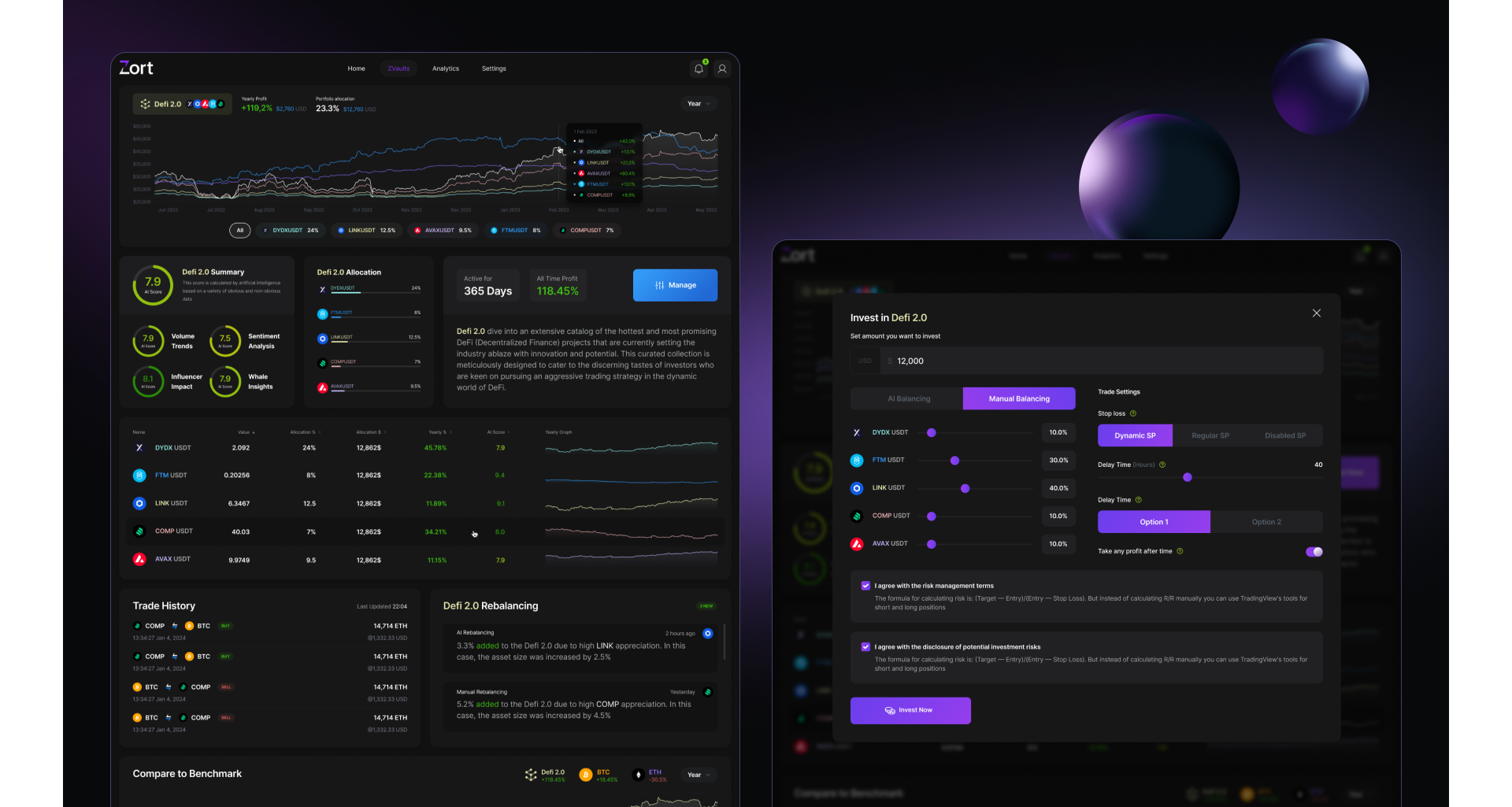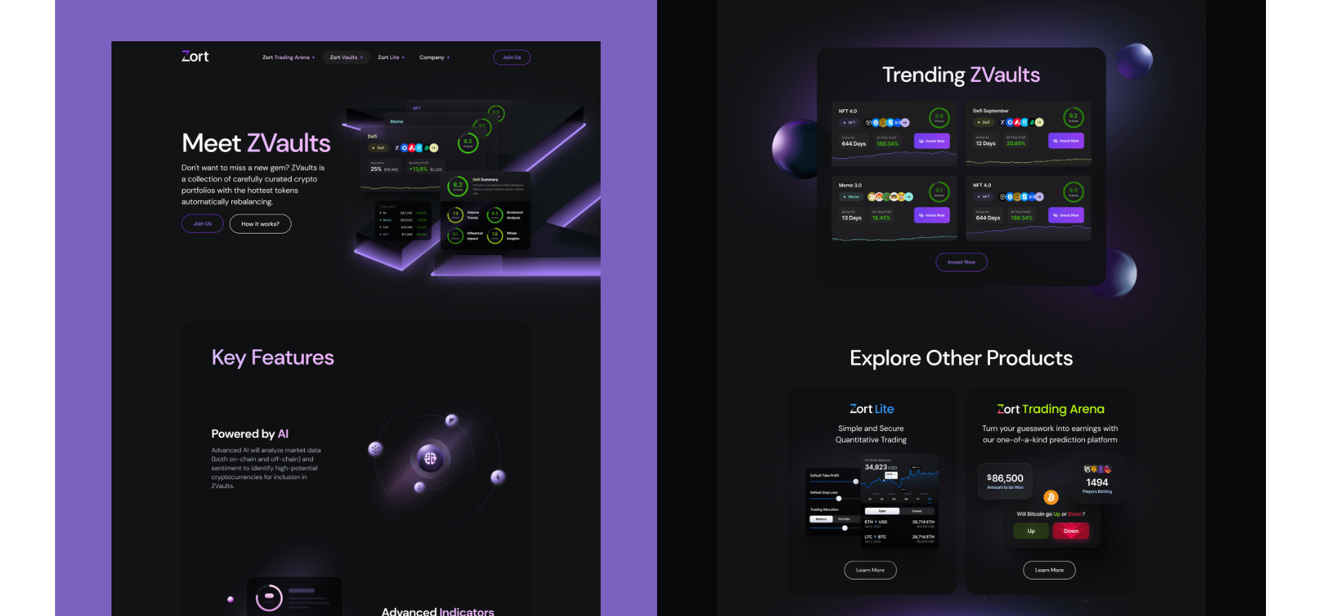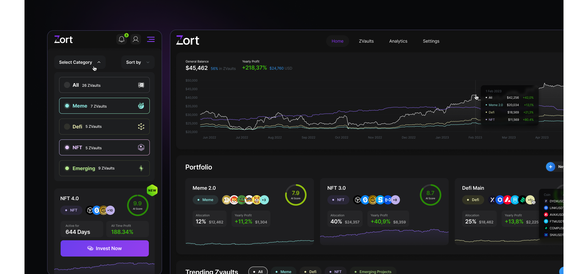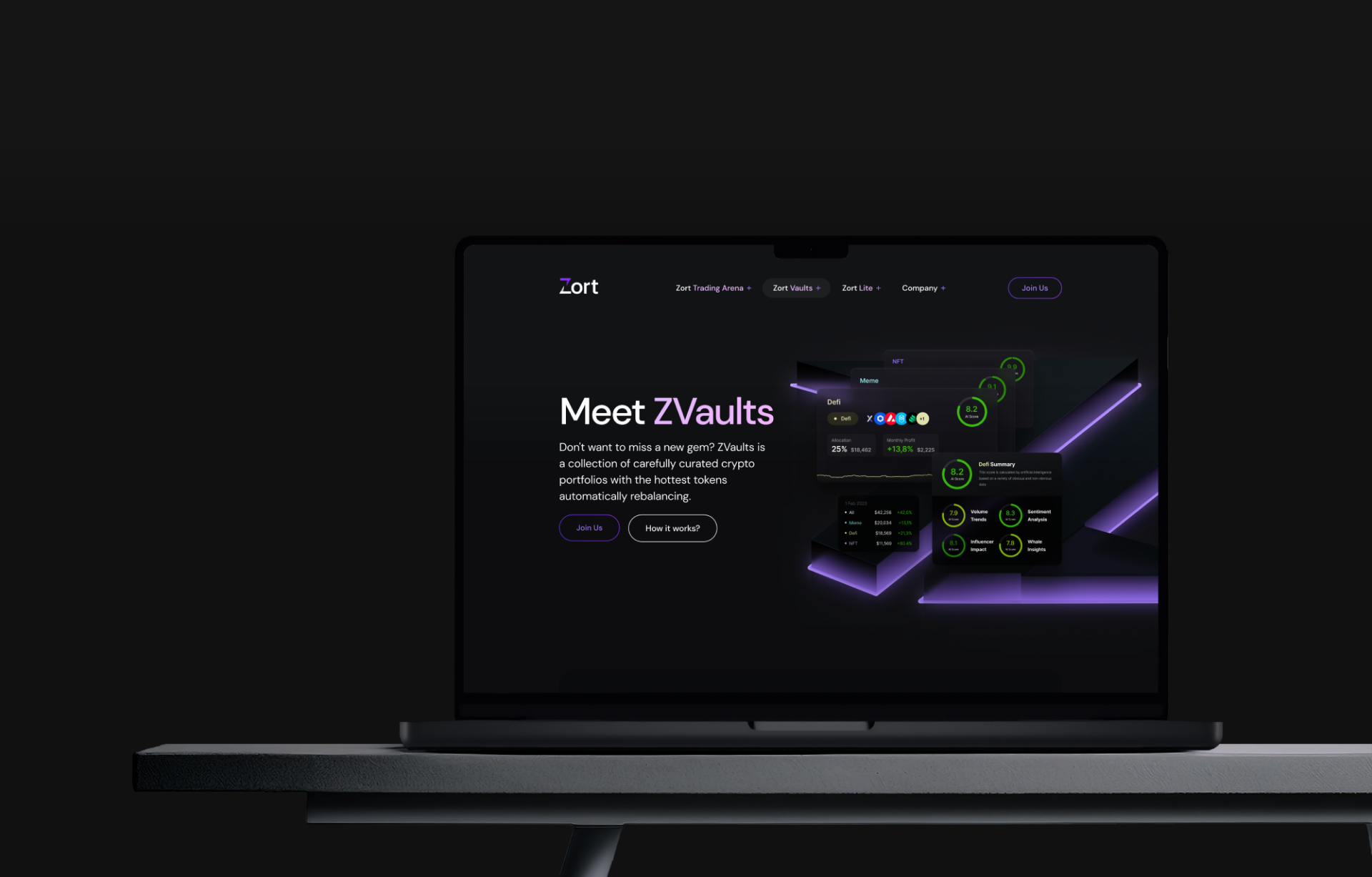 Zort — это сервис для управления пулом токенов на базе Uniswap. Он позволяет пользователю подключать кошелек, выбирать заранее заданный пул токенов (ZVault), и автоматически покупать или продавать токены в указанных пропорциях. Концепция направлена на упрощение процесса создания и управления инвестиционными портфелями в DeFi.
