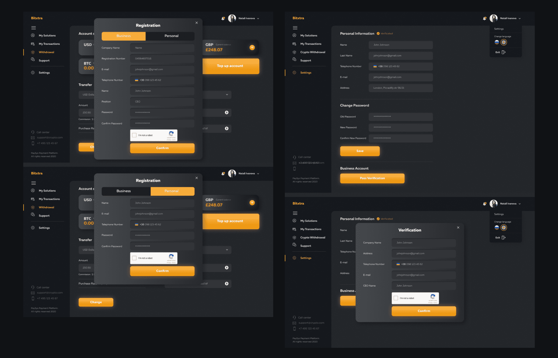 Разработать удобную и многофункциональную платформу для управления финансами. В которой пользователи смогут легко управлять своими личными данными, а также отслеживать состояние своих счетов в различных валютах, включая как фиатные, так и криптовалютные. Система позволяет получать наличные средства на свои счета напрямую из банков по всему миру через SEPA и SWIFT, а также осуществлять вывод средств на карты VISA и Mastercard.