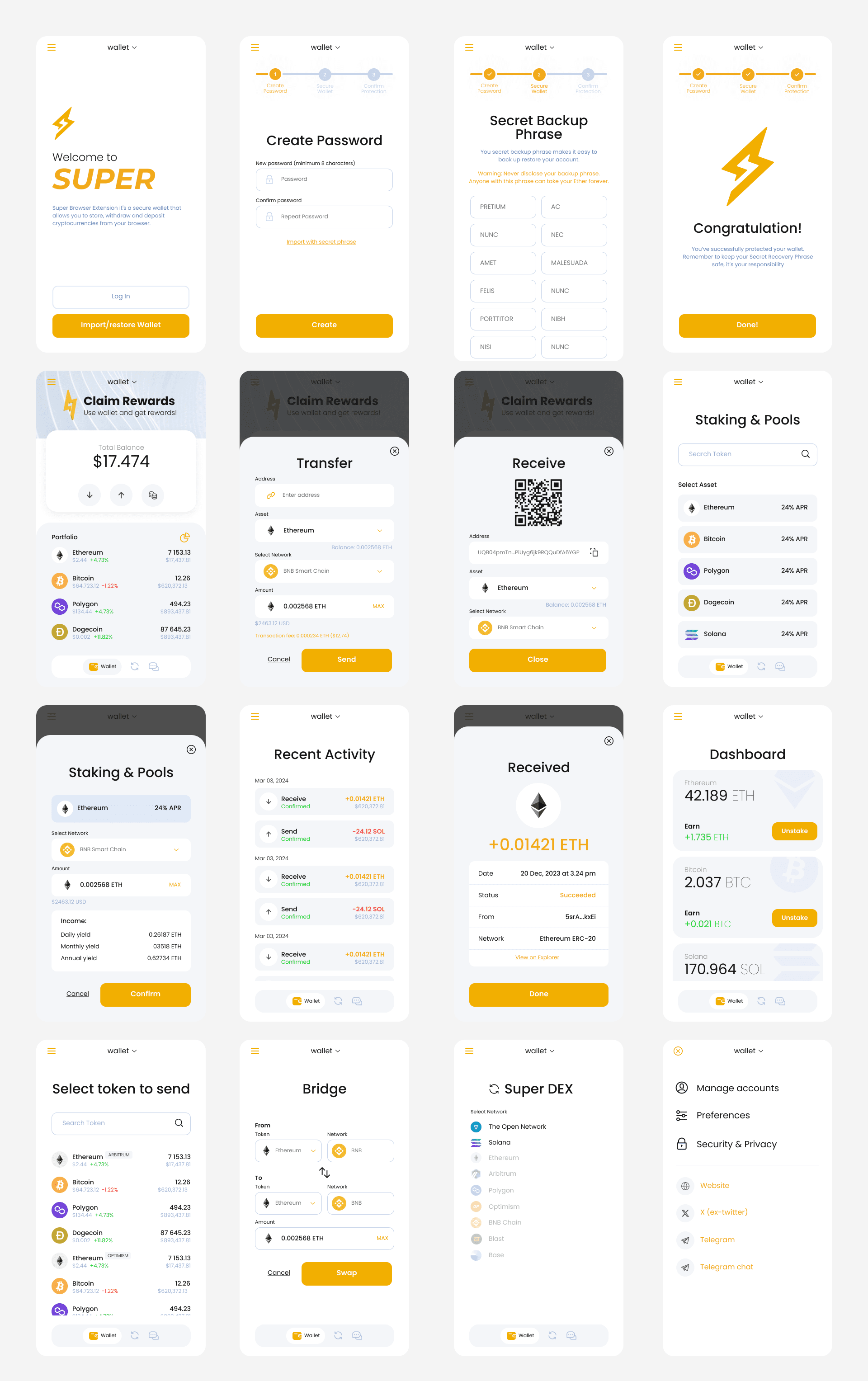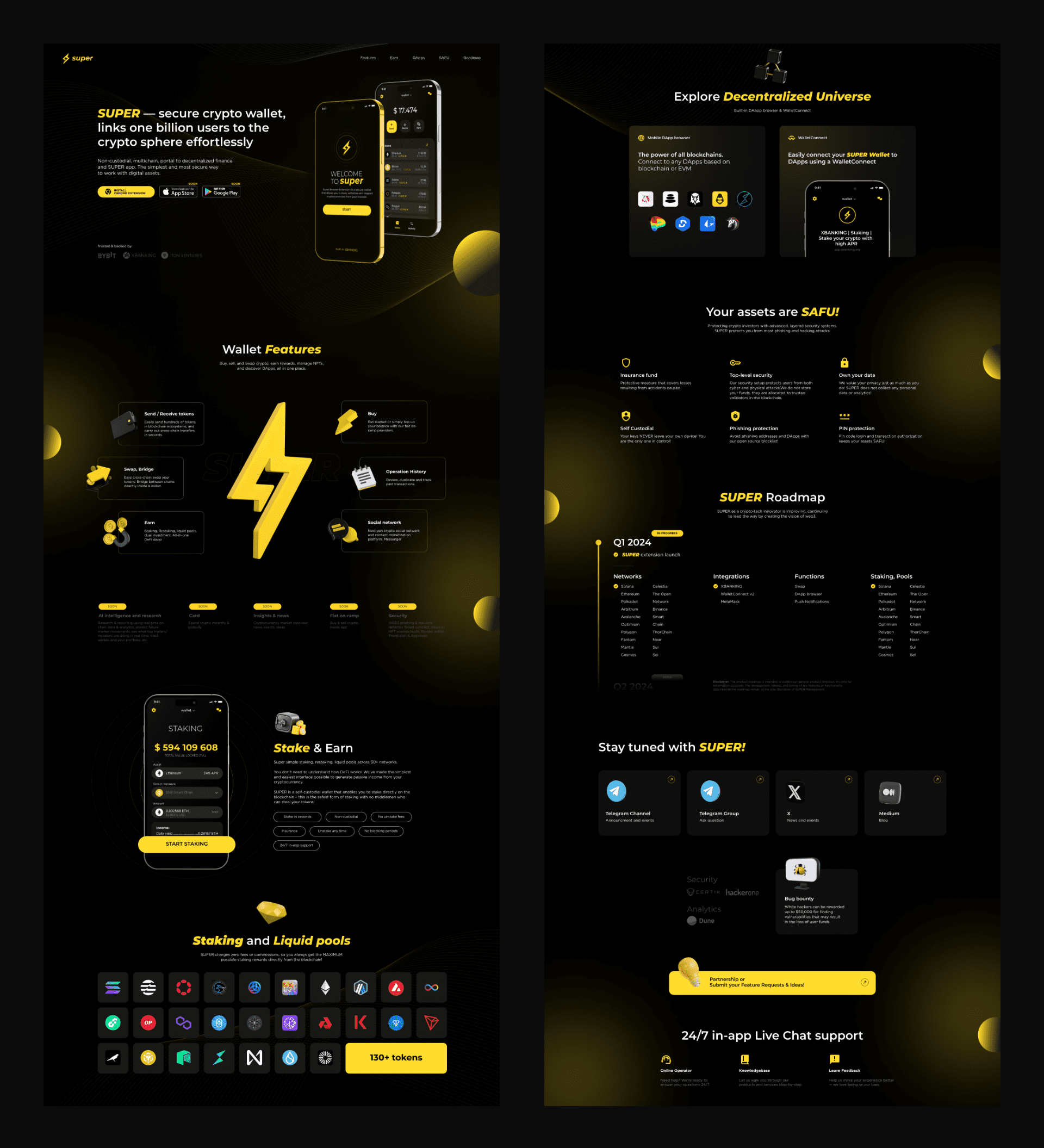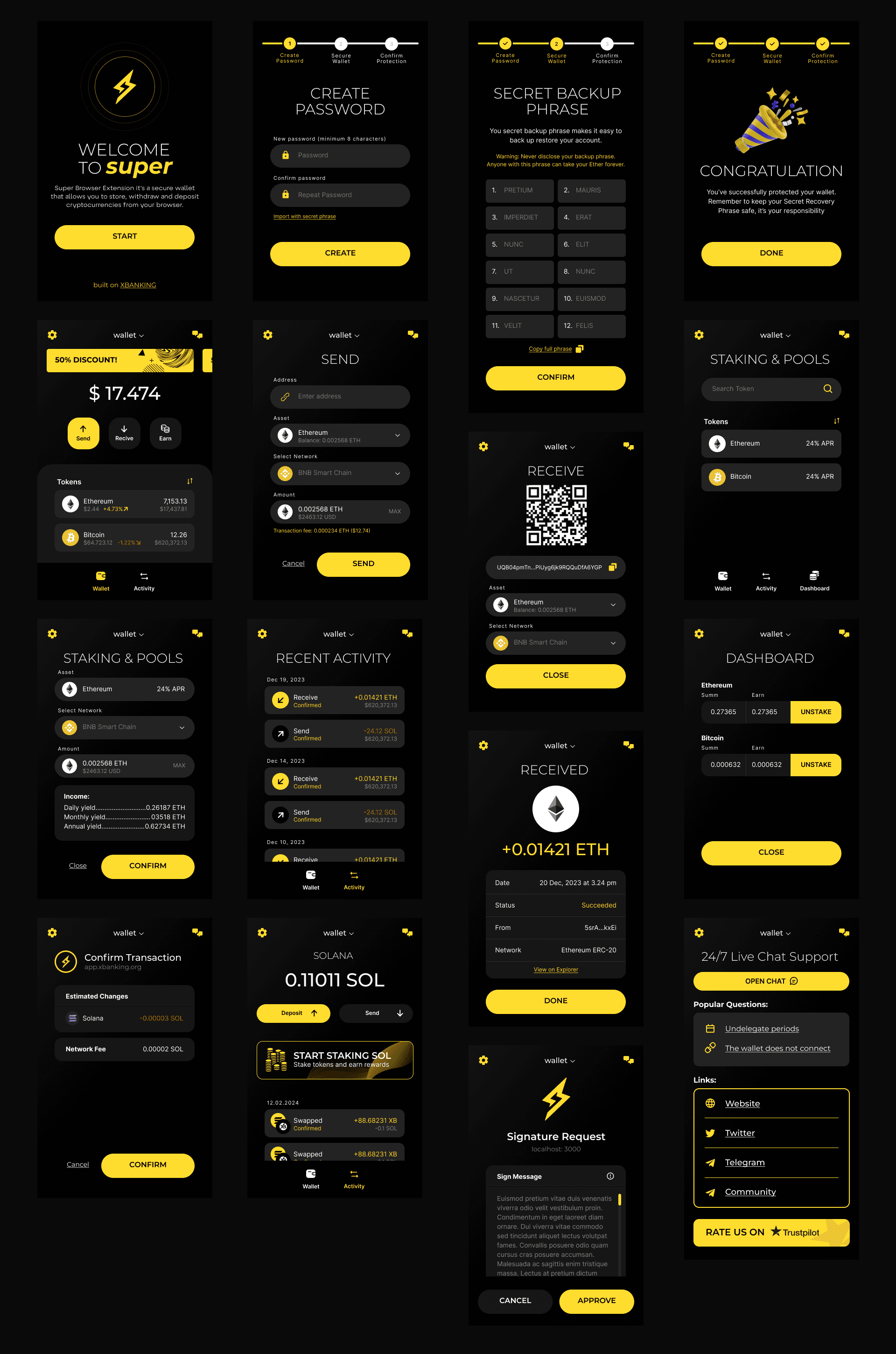 Создать безопасное и удобное расширение Chrome для криптокошелька: мульти-сети (EVM/BSC/Solana), онбординг с паролем и seed-фразой, отправка/получение и история, подпись для dApp, раздел Staking с APR и калькулятором, уведомления и 24/7 чат-поддержка.
