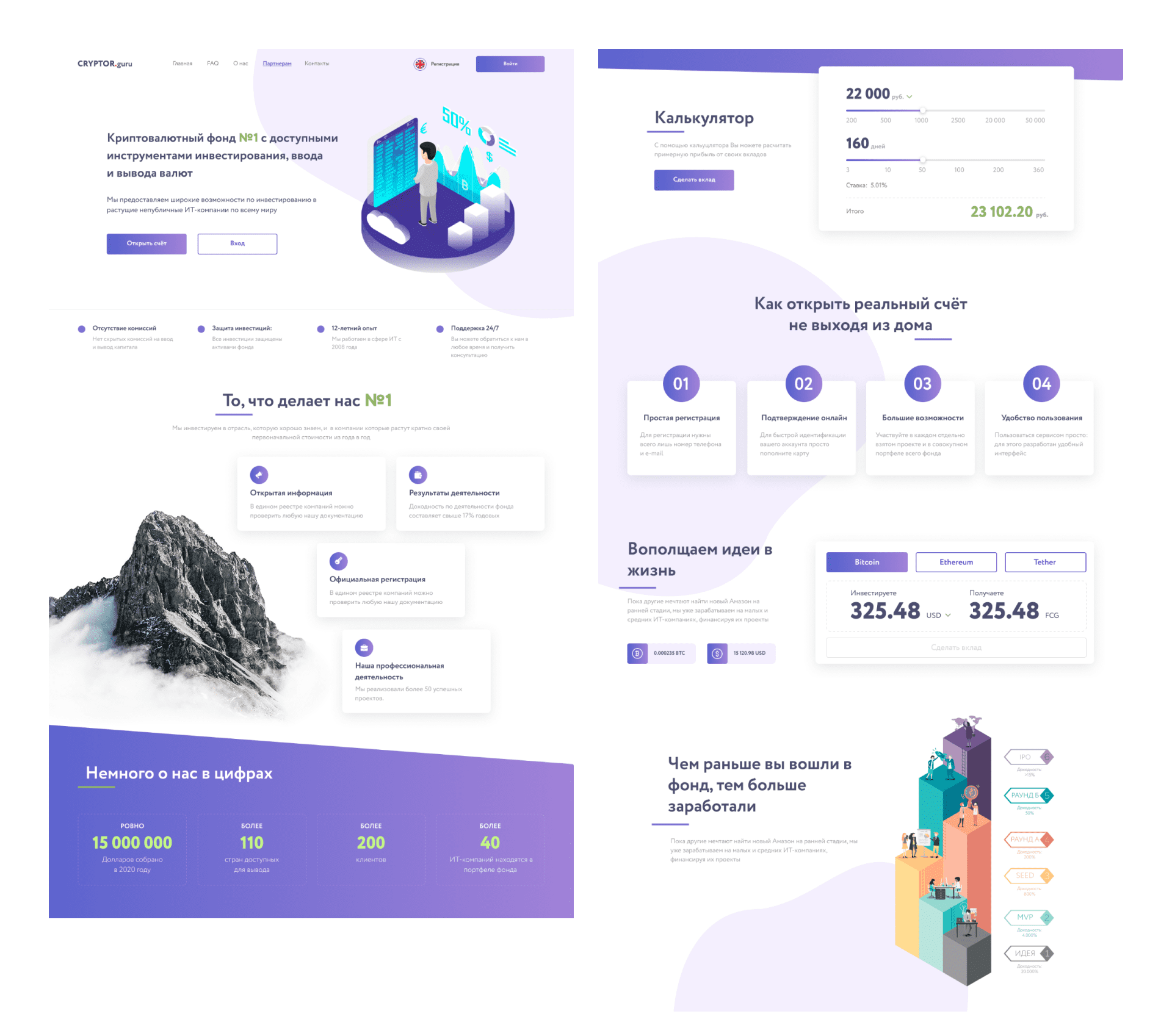 - Разработка уникального дизайна и верстки посадочной страницы для крипто-фонда. Дизайн был создан с учетом современных трендов и потребностей инвесторов, чтобы привлечь внимание и создать удобную среду для ознакомления с информацией о фонде.