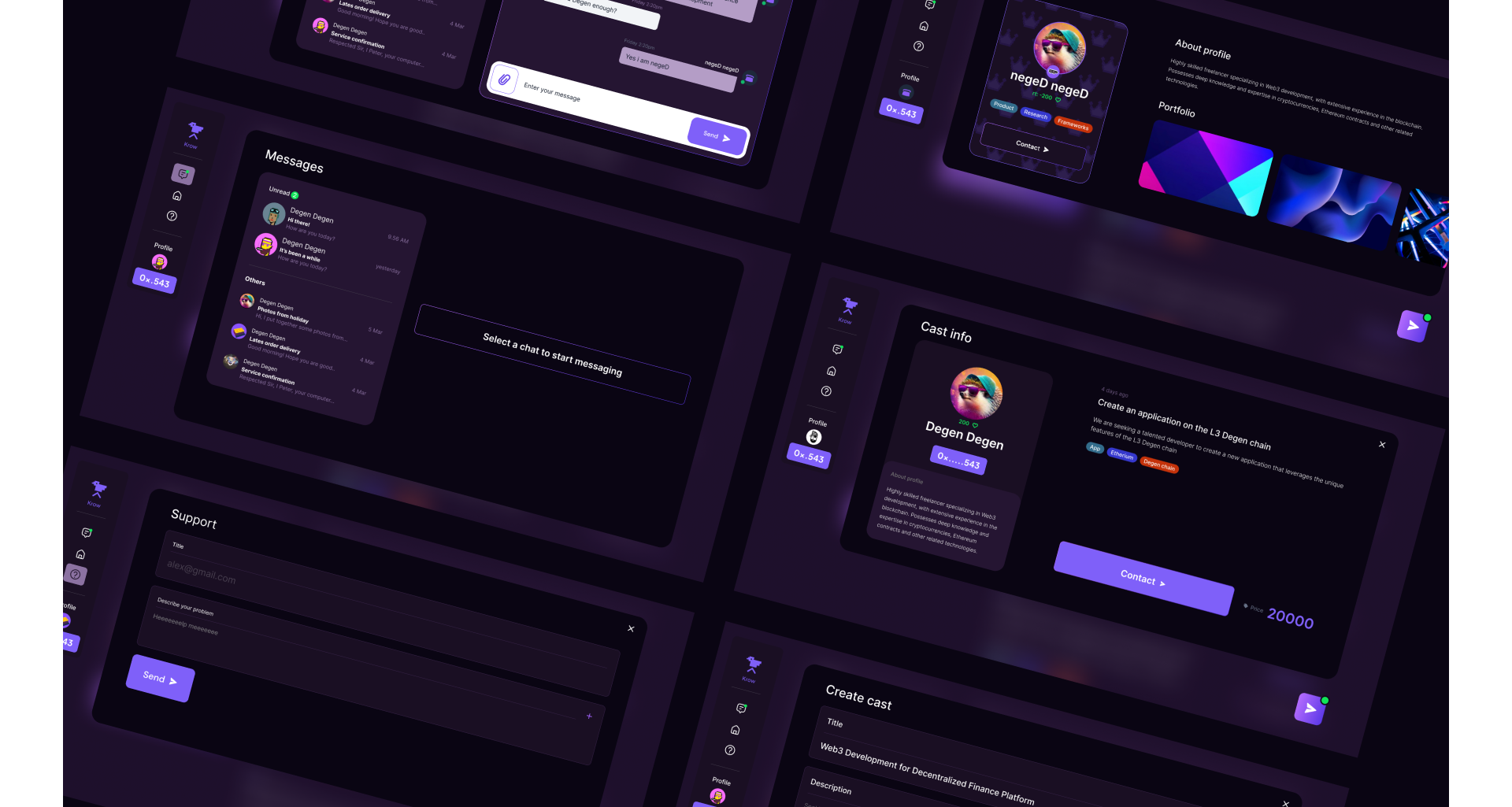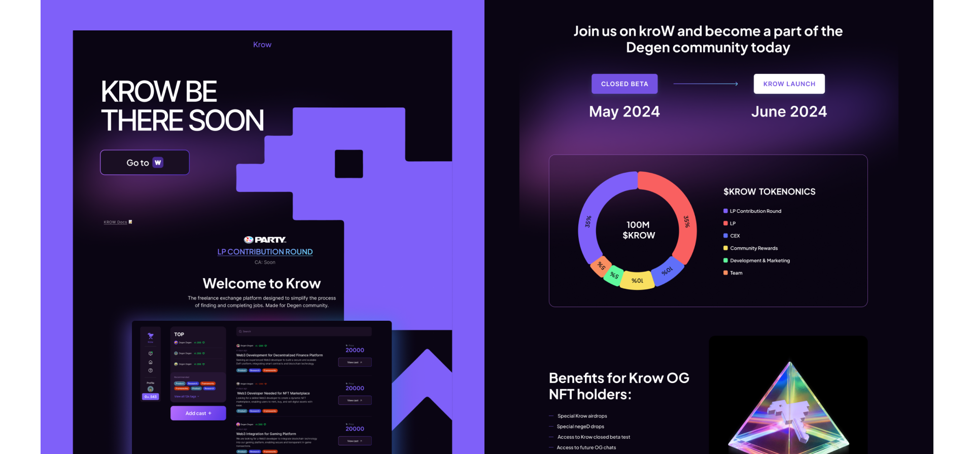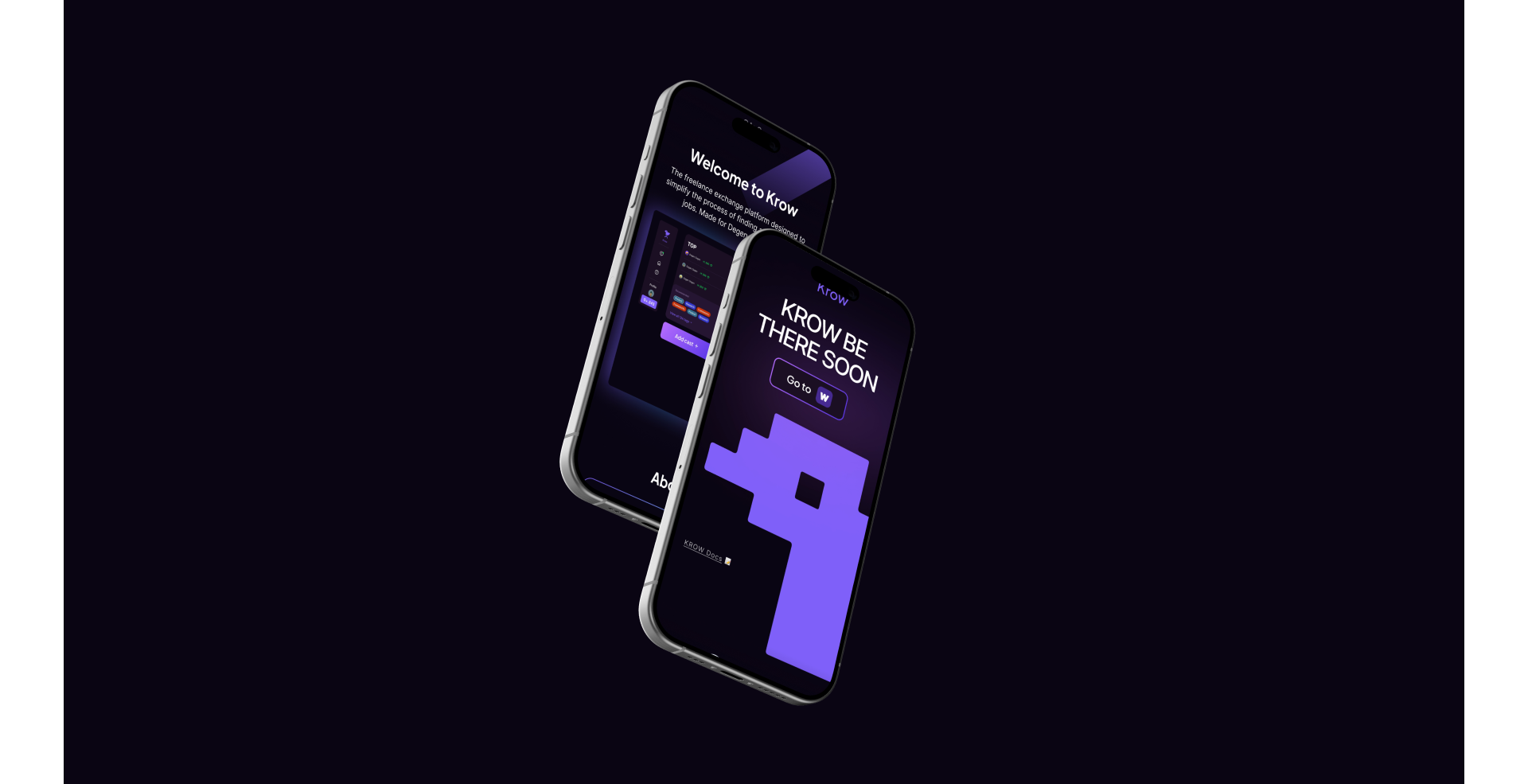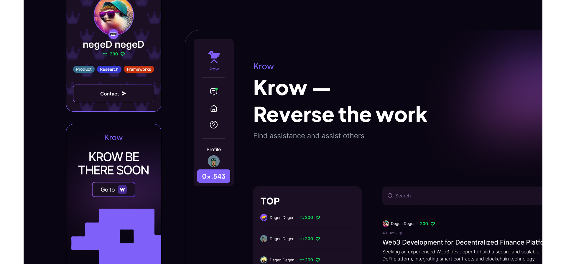 Модульный веб-продукт с упором на скорость сделки: лента Top и фильтры по тегам, карточки кастов с ценой и временем, экран Cast info с Contact, встроенный мессенджер, портфолио и Support, уведомления. Лендинг с оффером Reverse the work, токеномика $KROW, roadmap.