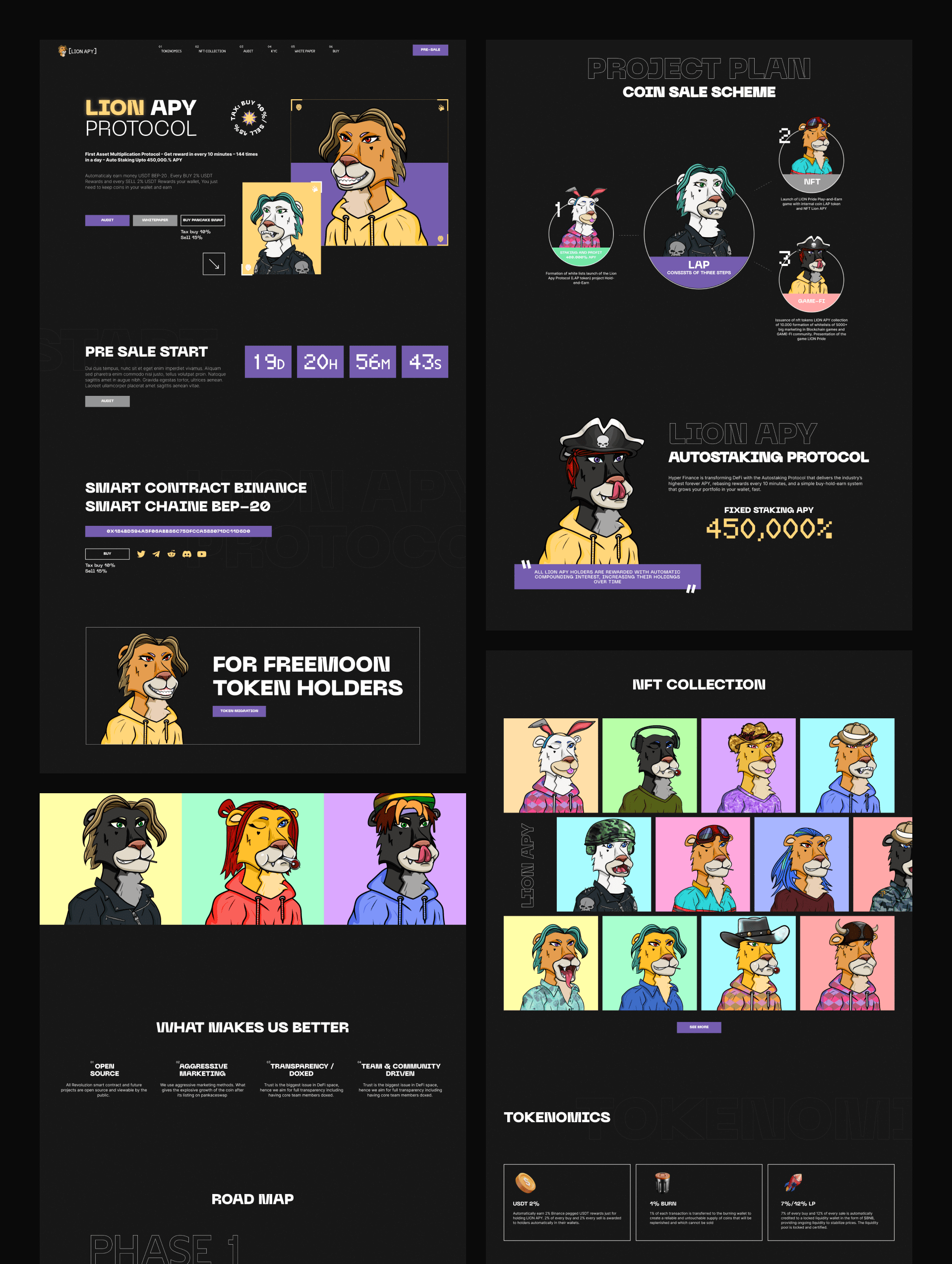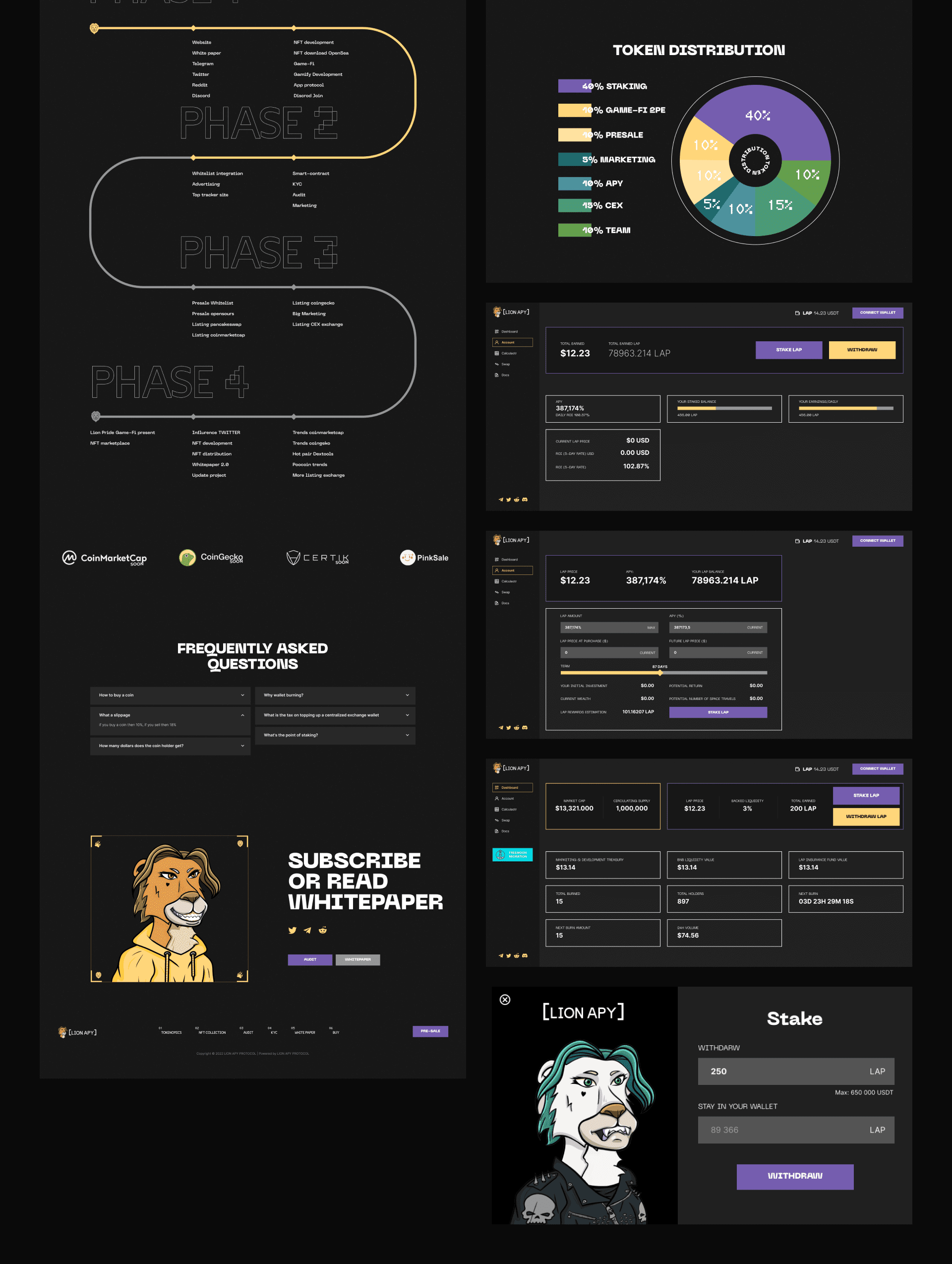 Создание интуитивно понятного и привлекательного интерфейса для пользователей, объединяющего функционал дизайна NFT-коллекций, стейкинга и DeFi операций, калькулятора доходности, статистики и интеграции с кошельками Metamask и TrustWallet.