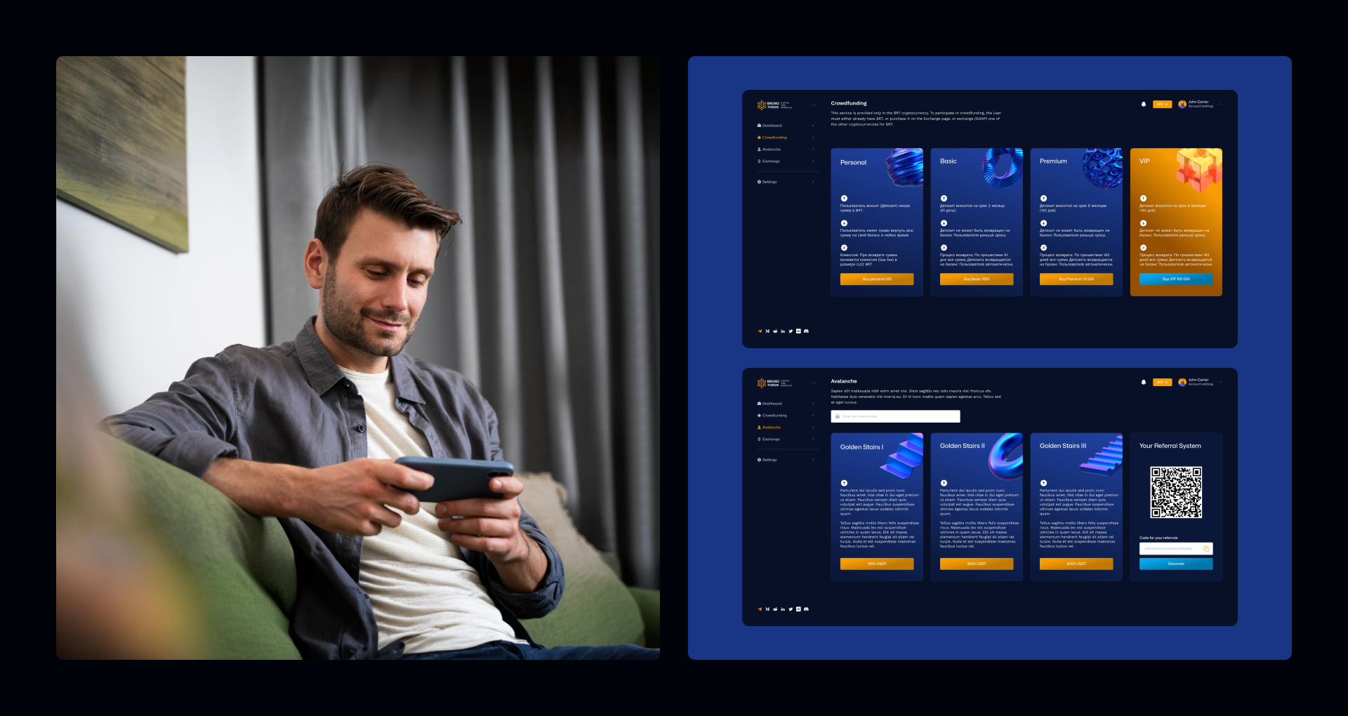 - Роли и разделы: гость/пользователь/админ/суперадмин; Crowdfunding, Registration, Avalanche, Exchange, Dashboard.