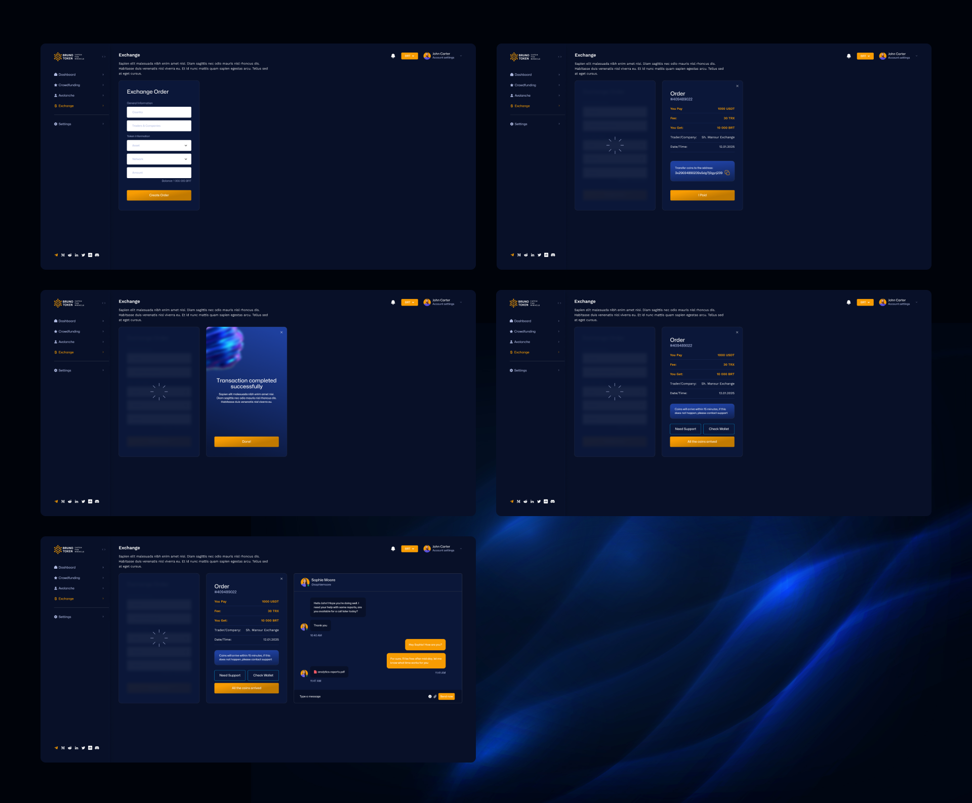 - Dashboard: активы/балансы, дивиденды, Send/Receive/Buy/Sell/History, чат поддержки.