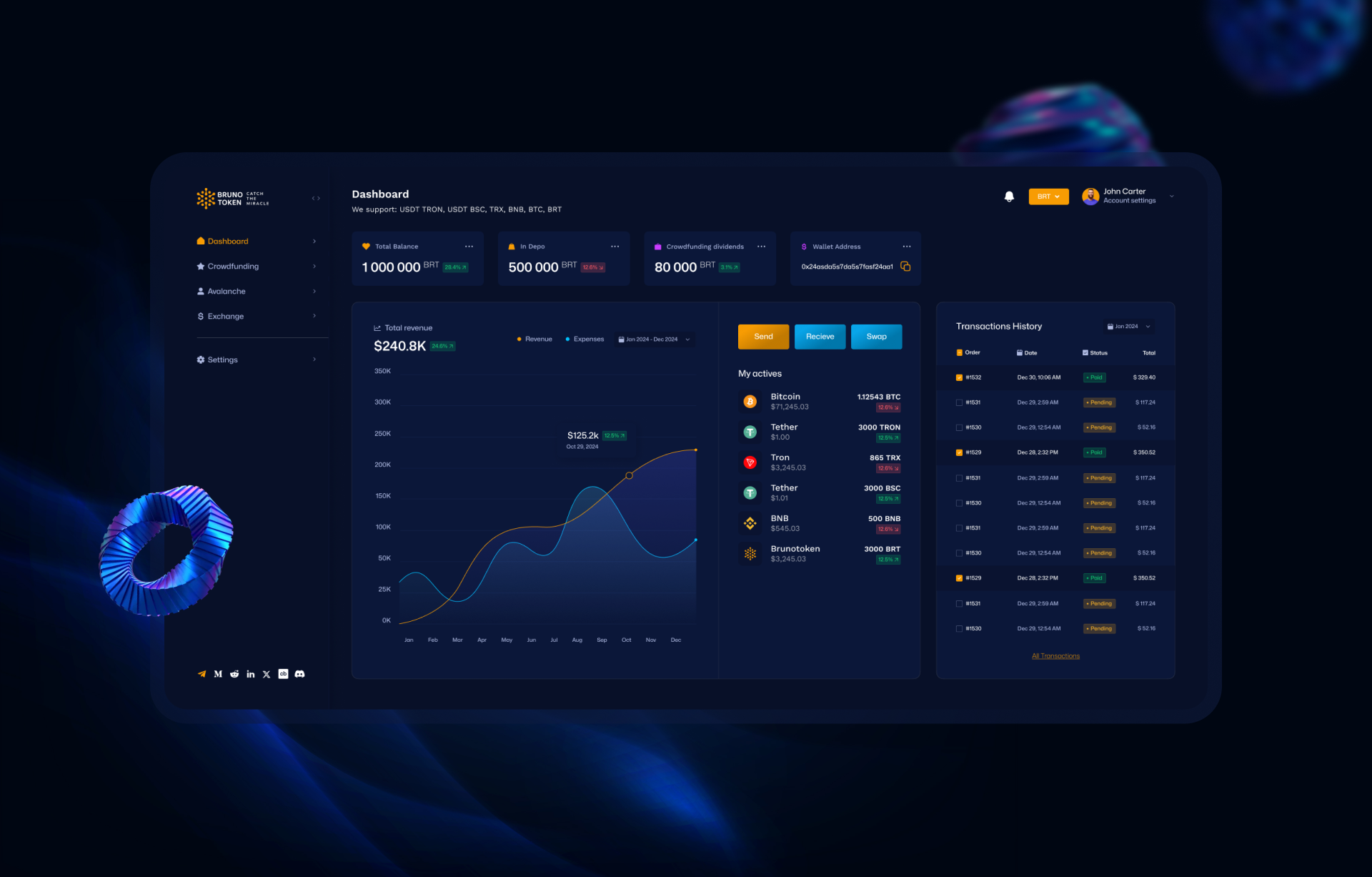 Создать веб-кабинет инвестора Brunotoken: KYC/AML-регистрация с 2FA, некостодиальный кошелёк с seed и мультисигом, приём/хранение/переводы и SWAP в сетях BTC/ETH/BSC/TRON, инвестиции в BRT (краудфандинг, покупка/продажа), депозиты c выплатами, рефералка, админ-панель.