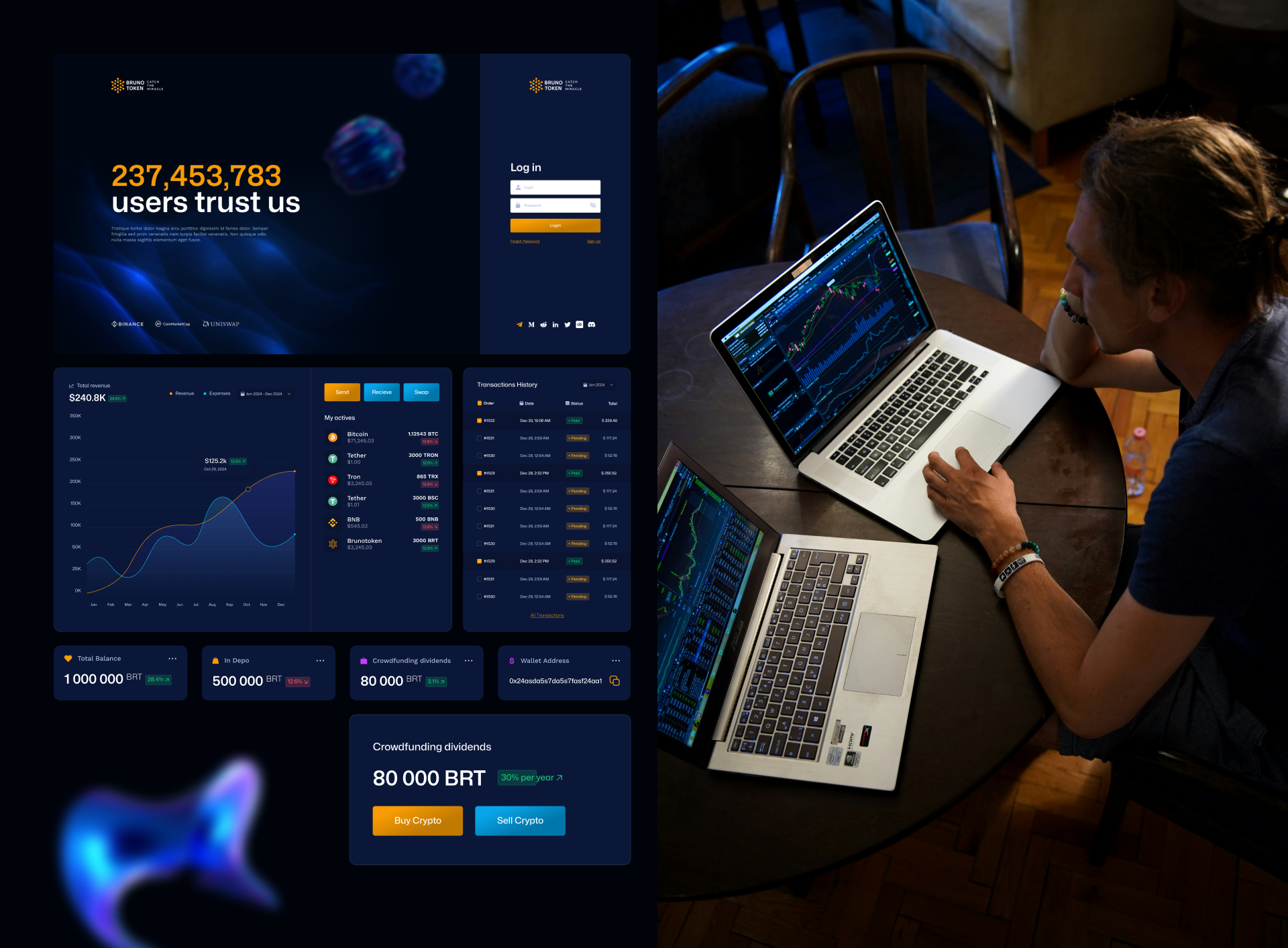 Модульная платформа с ролями (гость/пользователь/админ): онбординг с документами и селфи, кошелёк на seed, истории и лимиты комиссий, депозиты Personal-VIP и дивиденды, P2P-обмен с правилом 1 BRT = 1 USD, уведомления и суппорт.