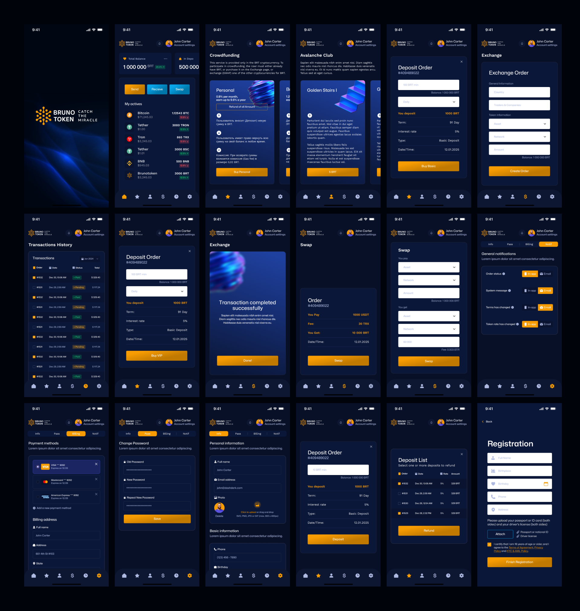 Модульный UX в React Native: главный экран с балансом и депозитами, список активов по сетям, флоу заказа депозита и обмена с расчётом комиссии, SWAP и экран успеха, история транзакций, настройки профиля и уведомлений, методы оплаты.
