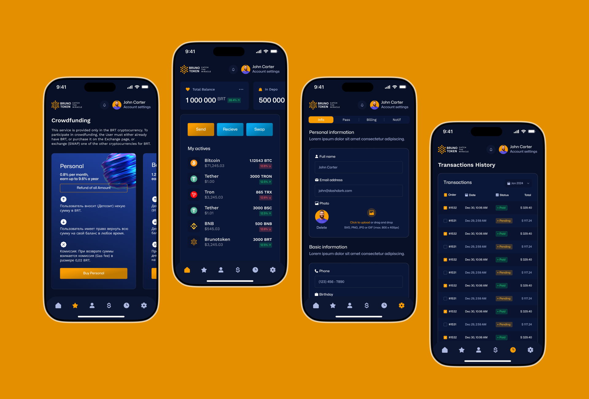 Разработать мобильное приложение для инвесторов Brunotoken: кошелёк с быстрыми действиями Send Receive Swap, покупка пакетов и вступление в клуб, депозиты с расчётом ставок, обмен и SWAP, история и уведомления, платежи картой и криптой, регистрация с документами, стабильный CI/CD.