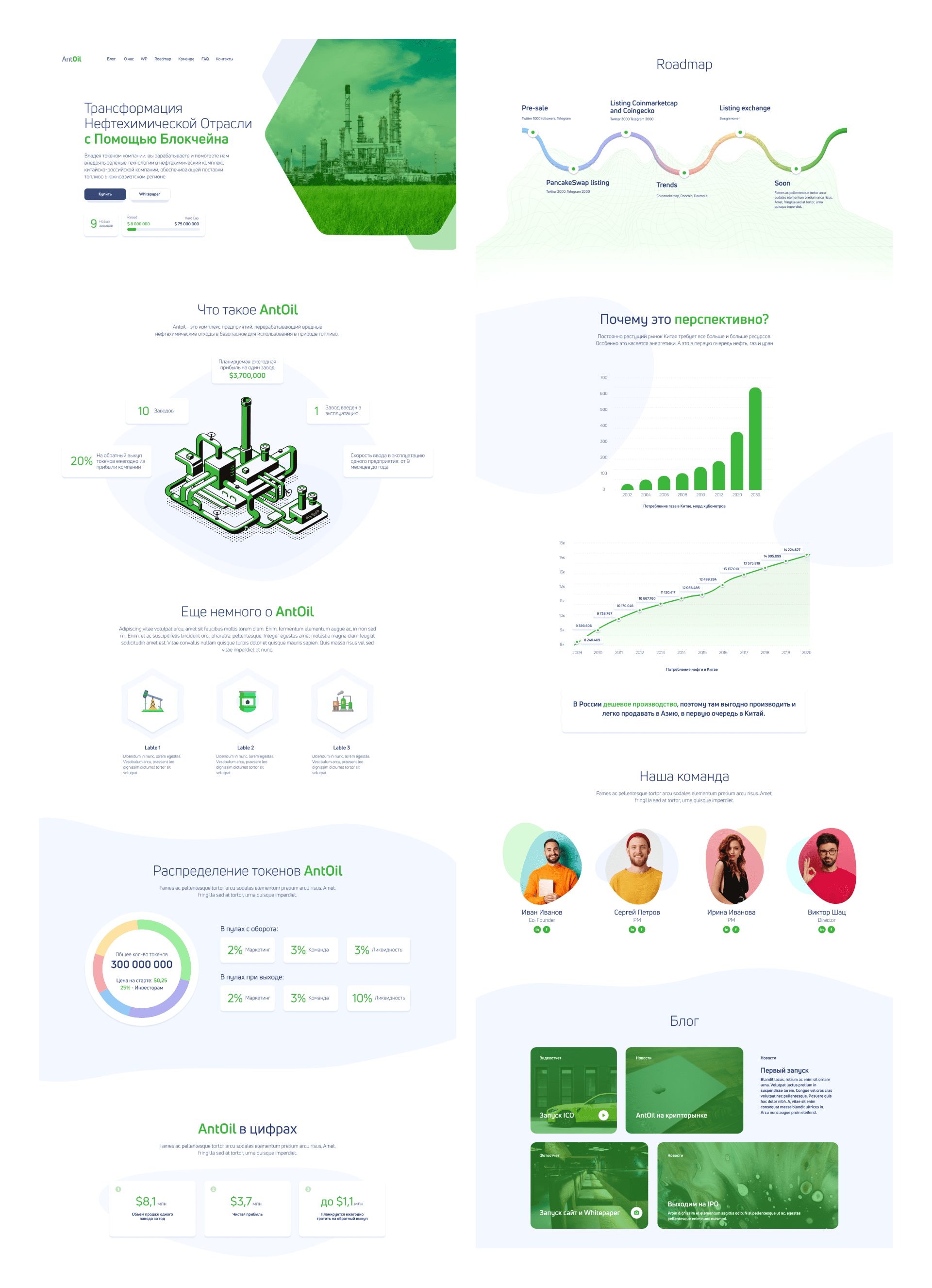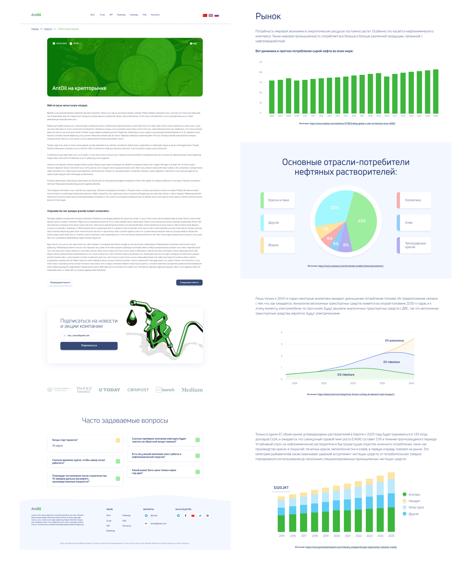 Запустить веб-платформу Antoil для токенизации нефтепродуктов и презентации проекта для инвесторов: лендинг с УТП и метриками, токеномика, roadmap, команда, блог и подписка. Обеспечить аналитические графики рынка и многоязычие RU/EN, стабильный CI/CD.
