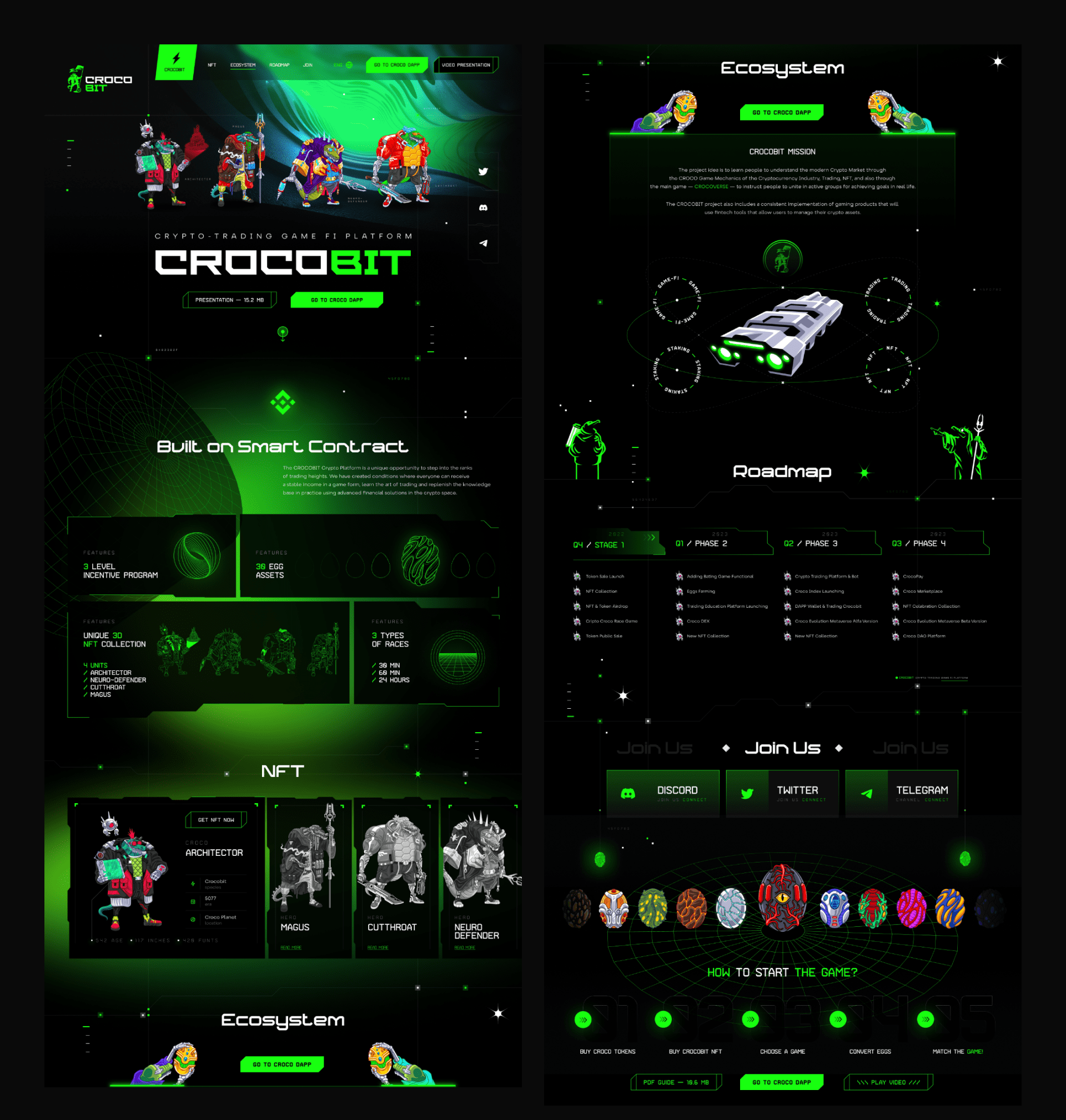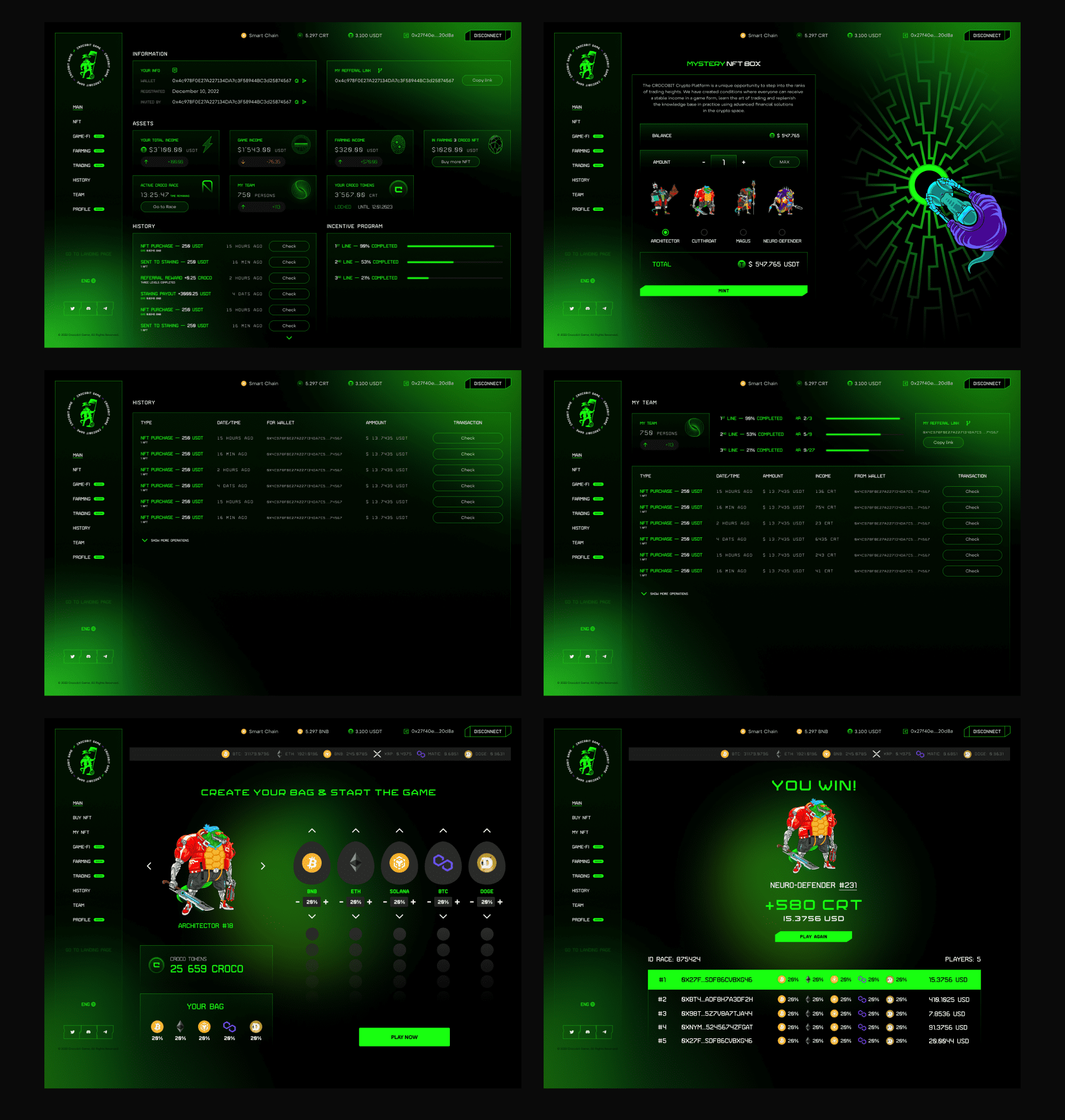 Создание инновационной блокчейн платформы, объединяющей в себе элементы NFT коллекции, игровой механики для криптовалютных трейдеров, стейкинга и файрминга для холдеров NFT, свапа токенов и эффективной реферальной программы.