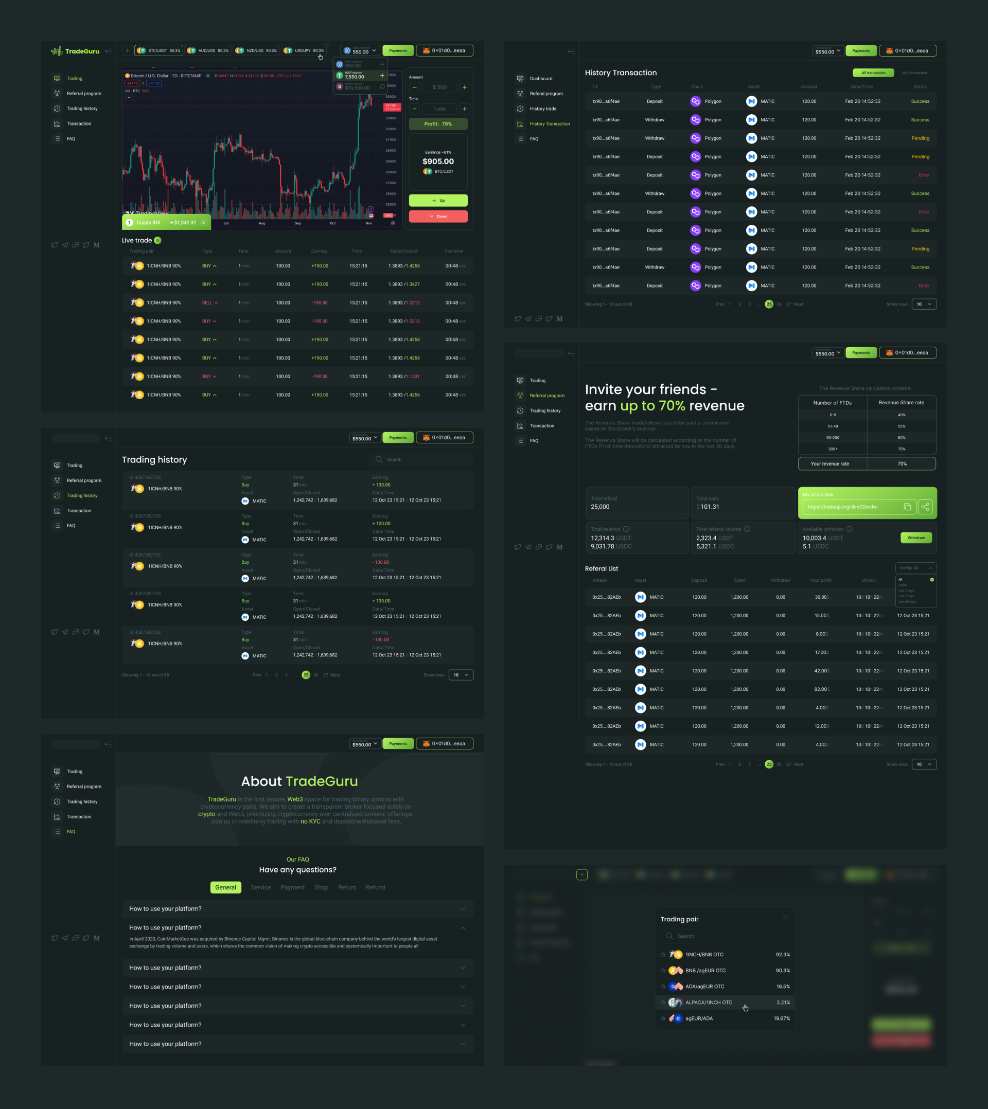 - Боковая навигация по разделам Trading, Trading history, History transaction, Referral, FAQ.